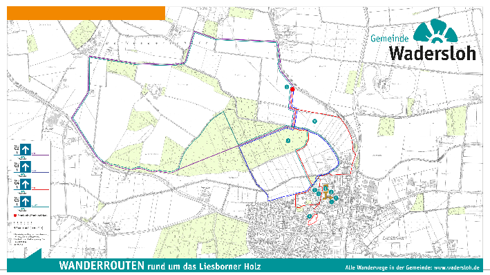 Der Hauptwanderweg X1 des Westfälischen Heimatbundes verbindet als überregionaler Wanderweg Lippstadt mit Olfen. In der Gemeinde Wadersloh trifft er auf den Wanderweg X22 aus Münster. Die Teilstücke zwischen Beckum, Diestedde, Wadersloh, Liesborn und Lippstadt lassen sich bequem in Kombination mit dem Regio-Bus R72/R73 erwandern.